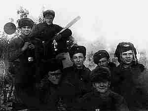 Возле полевой кухни. Слева направо вверху: курсанты Василенко В. С., Варламов А. М. В нижнем ряду справа налево: с-нт Богуш В. Г., курсанты Шупрута А. Н. и Арсеньев Е. А.