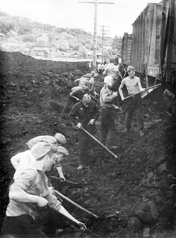Но самой тяжелой была работа по разгрузке железнодорожных вагонов с углем. Уголь подвозился и зимой и летом, так как емкость угольного склада не позволяла заготовить необходимое количество угля в теплое время года. Как правило, это был железнодорожный состав из 10-15 63-тонных вагонов.