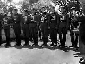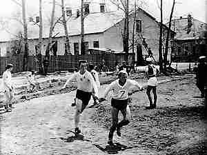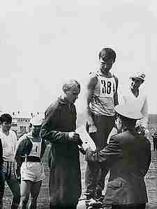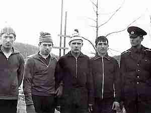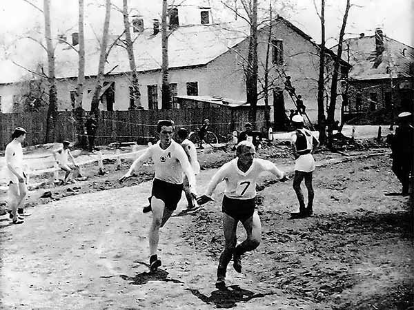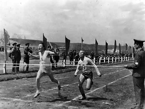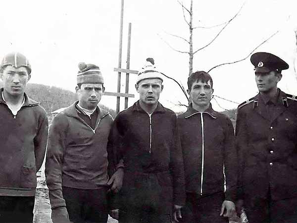 Участники соревнований по легкой атлетике. Слева направо: Михаил Погодаев, Виктор Гайнц, я, Валерий Игнатенко и Александр Глуховеров