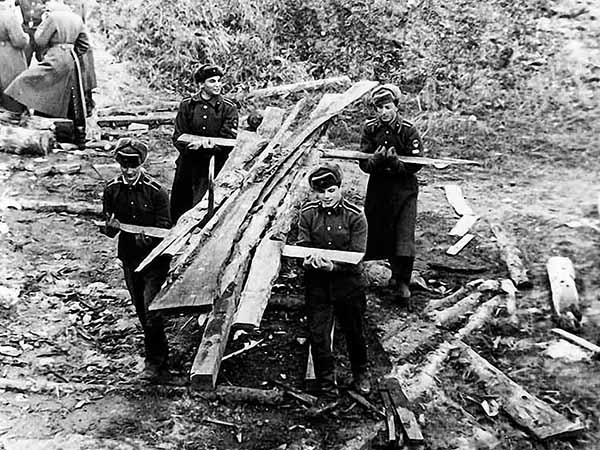 Работы по обустройству танковых окопов. Слева спереди мл. с-нт Александр Булгаков, справа - Нежинцев В. Ф. Сзади слева - Рашид Шагиросланов, справа - Василий Гопанюк.
