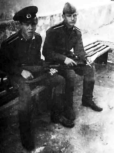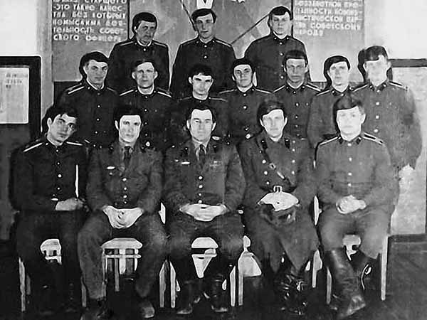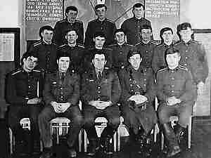 Собираемся после зимнего отпуска. В центре замполит батальона подполковник Барышев В. Ф. Слева от него командир 1 и 2 взводов 8 роты лейтенант Каратаев Н. А., справа - командир 3 и 4 взводов лейтенант Иванов С. В.