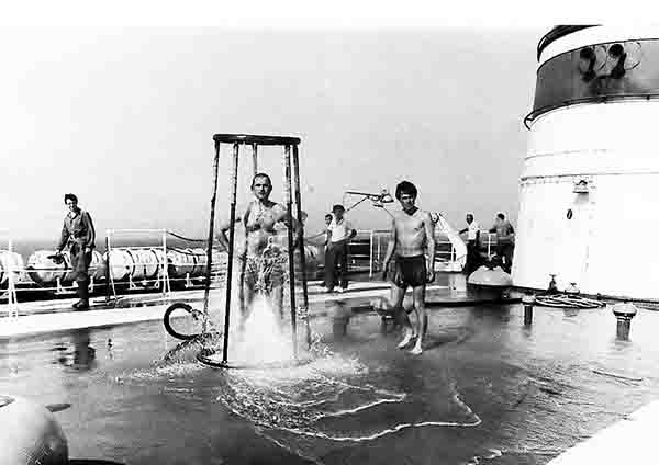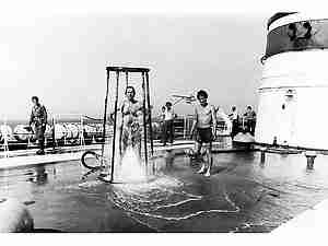 Водные процедуры на верхней палубе корабля. Военный вояж Баку -- Красноводск и далее на Ашхабад. Танки в трюмах задыхаются от жары. Наверное войдем в Афган.