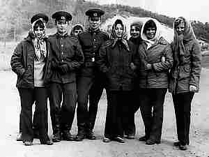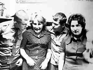 Курсанты моего взвода ведут шефскую работу с студентками техникума Советской торговли. Впереди Славик Соков и Вася Фадеев. Сзади торчит, наверное, моя фуражка.