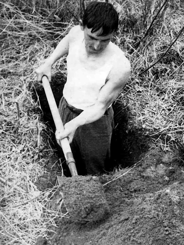 Окапываемся! Приходько В. В. роет одиночный окоп для стрельбы стоя...
