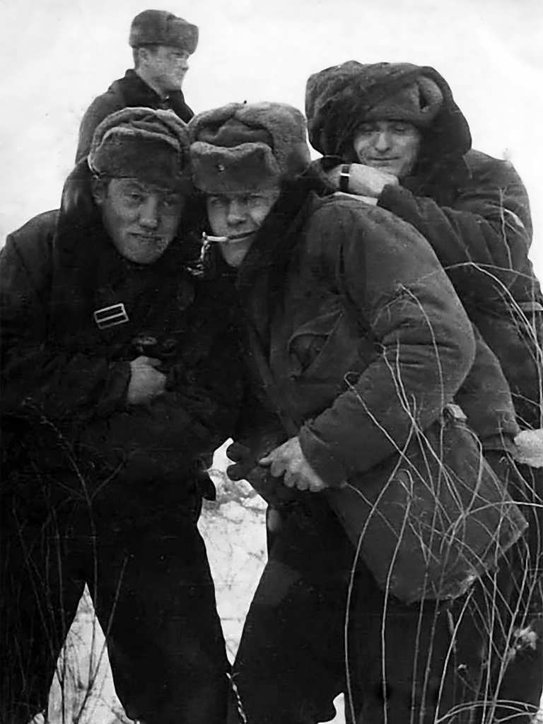 Разминка "для сугреву" на морозе. Слева направо: Свиридов А. В., Широков П. Л., Приходько В. В. На заднем плане - Замятин С. П.