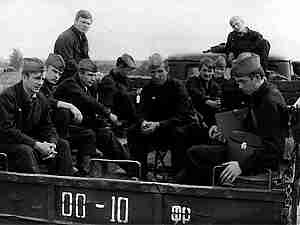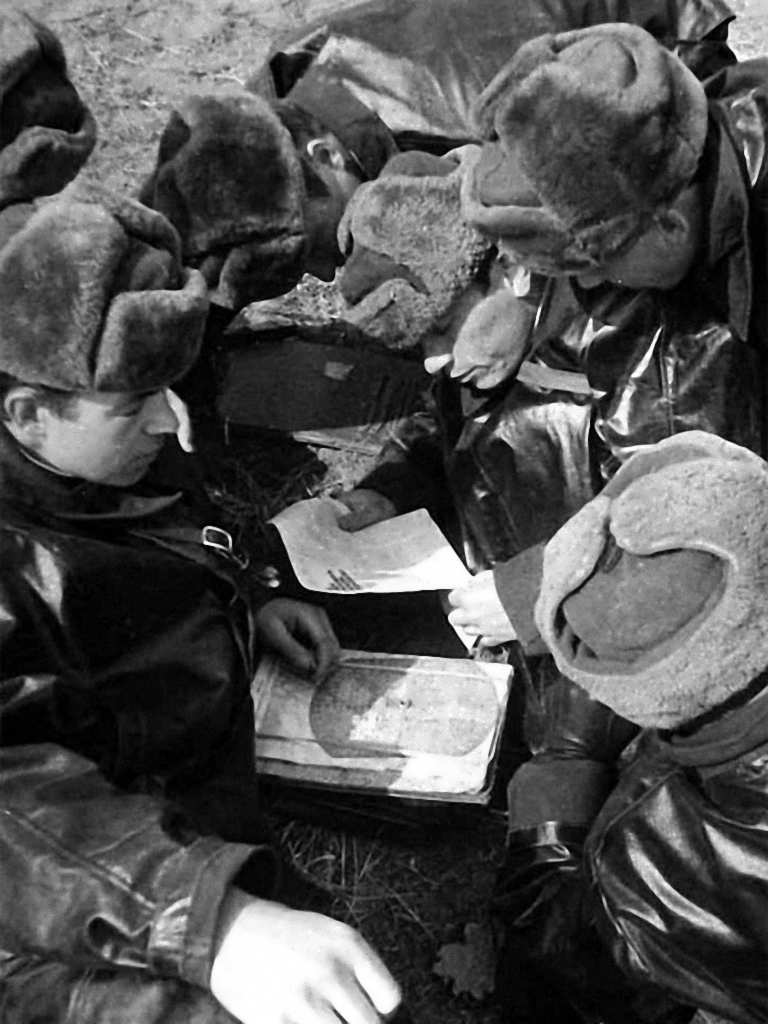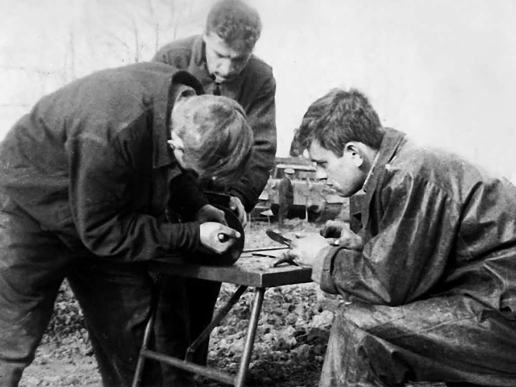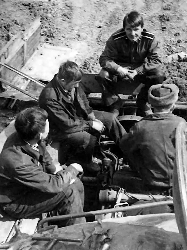Арсеньев Е. А., Ван В. Я. и Белашко В. Н. на полевых занятиях по ремонту и эксплуатации.<