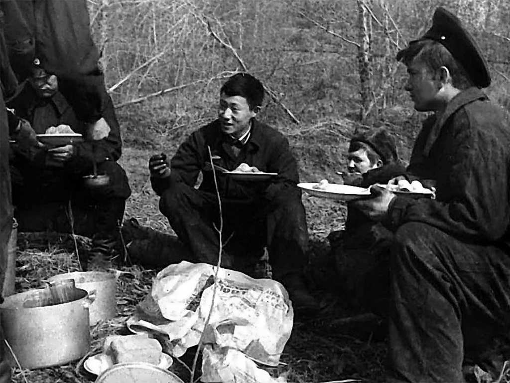 Обед в полевых условиях. В центре Ван. В. Я., правее - Белашко В. В., слева Неваленный А. Н.