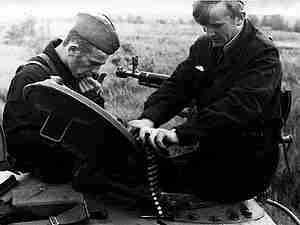 Ривкинд Н. М. и Неваленный А. Н. снаряжают пулеметные ленты патронами.