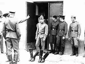 Комбат снимает хромовые сапоги с курсантов на выходе из казармы после объявления общего построения.