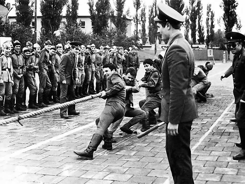 Перетягивание каната на армейском спортивном празднике. 100 ТП. г. Френштат под Радгоштем. ЦГВ. 1981 г.