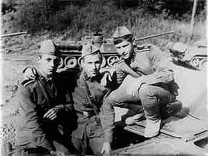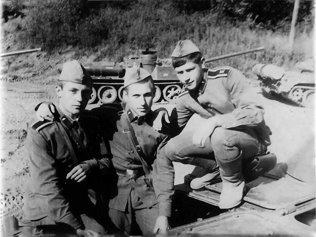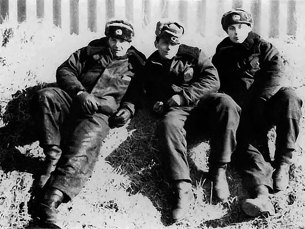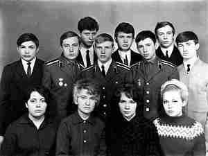 Курсанты в отпуске среди одноклассников. Слева направо: Супрун Н. М., Варламов А. М. и Гайнц В. А.